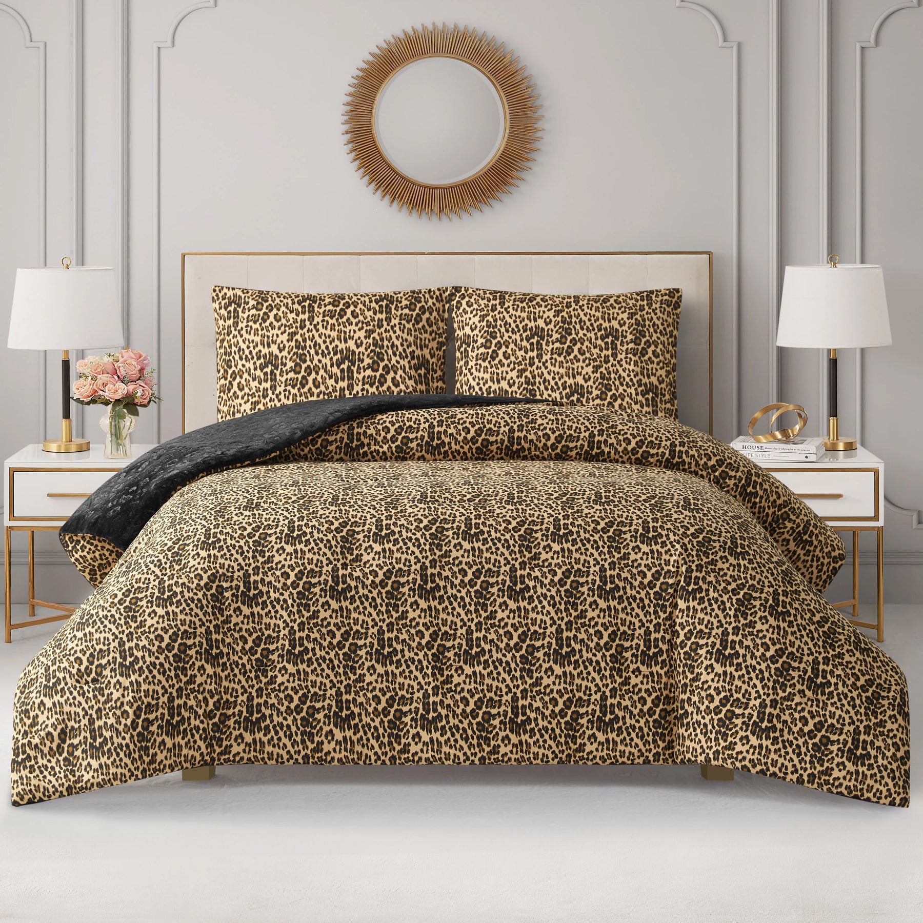 Transform your bedroom into a stylish refuge with this luxurious reverse comforter set that features a captivating embossed leopard design and a regal counterpart for versatile styling.